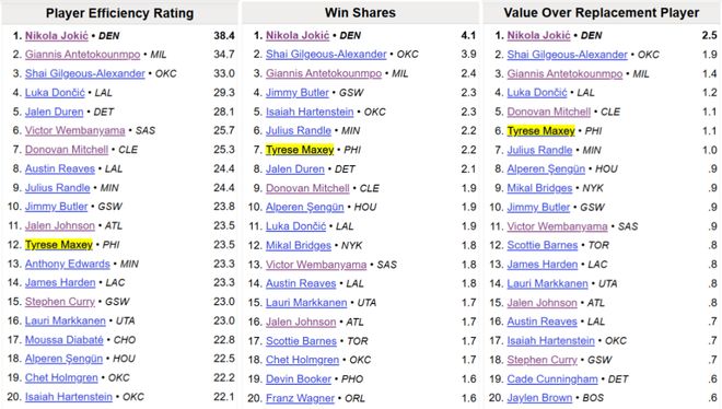BBR的高阶数据,马克西的PER值、WinShare、VORP(不可替代值)、BPM分别排在联盟第12、第7、第6、第7,多项数据后面跟的还是库里、文班这样的大佬。